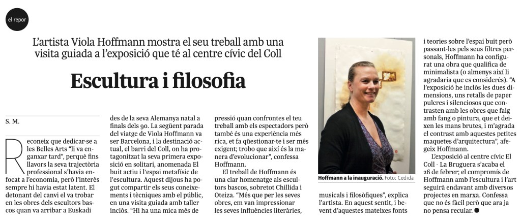 Poster Exposición individual – Centre Civic El Coll – La Bruguera, Artículo de L’independent de Gràcia, Cultura 17. Feb. 2023 https://www.independent.cat/noticia/81819/escultura-i-filosofia